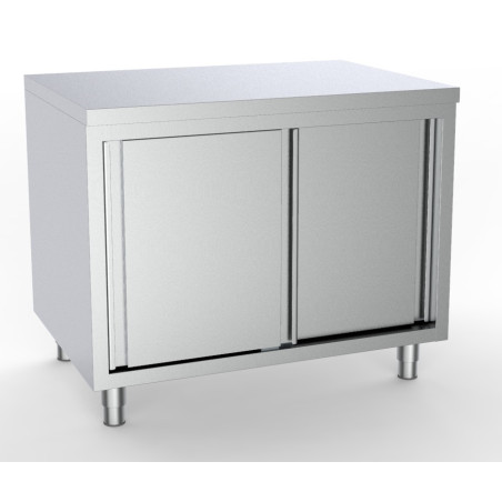 Die Wahl von Edelstahl AISI 430 für die Herstellung dieses Möbels garantiert außergewöhnliche Widerstandsfähigkeit und Reinigungsfreundlichkeit. Das Fehlen eines Spritzschutzes ermöglicht eine nahtlose Integration an verschiedenen Standorten in einer Profiküche, während die beiden vollflächigen Schiebetüren den Zugang und die optimale Nutzung des Stauraums unter der Hauptarbeitsfläche erleichtern.