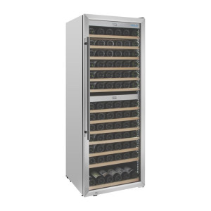 Mit einer robusten Edelstahlstruktur ausgestattet, behält dieses Modell eine visuelle Eleganz bei und ist dank seiner vollflächigen Schwingtür und der Innenbeleuchtung, die die gelagerten Weine hervorhebt, funktional. Seine äußere Silber-/Edelstahloberfläche ergänzt nicht nur das Dekor jeder Profiküche, sondern ist auch leicht zu reinigen und zu pflegen. Der Kühlschrank misst 595 mm in der Länge, 621 mm in der Tiefe und 1575 mm in der Höhe, ein vernünftiger Platzbedarf, der eine solide Präsenz anzeigt, ohne den Raum zu dominieren.