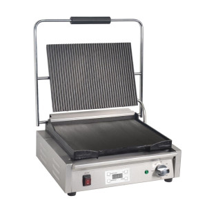 Les dimensions généreuses des plaques, 344 x 230 mm, permettent d'optimiser l'espace de cuisson, rendant ce gril idéal pour traiter simultanément plusieurs pièces de viande ou sandwichs, maximisant ainsi le rendement lors des heures de pointe. La conception hybride de la surface de cuisson propose une partie rainurée, offrant des marques de grillades esthétiquement plaisantes et une partie lisse, parfaite pour cuire des aliments délicats ou moins épais.