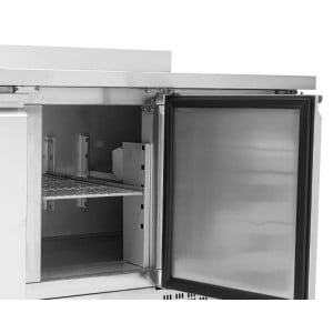 De tafel is uitgerust met drie volle draaideuren, ideaal voor gemakkelijke toegang tot de producten terwijl het verlies van kou wordt geminimaliseerd. De opstaande rand voorkomt voedselverlies achter de eenheid en verbetert de hygiëne door het schoonmaken te vereenvoudigen. Bovendien, met een voeding van 220 V en een vermogen van 435 W, combineert het energiebesparing en efficiëntie, mede dankzij het gebruik van het koelmiddel R290, met een verminderde ecologische impact.